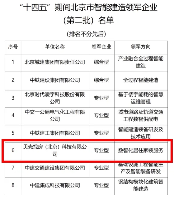 九游体育8月27日,北京市住房和城乡建设委员会公布了“十四五”期间北京市智能建造领军企业(第二批)名单,贝壳找房(北京)科技有限公司等8家企业入选,贝壳整装是唯一入选该名单的家装企业。
